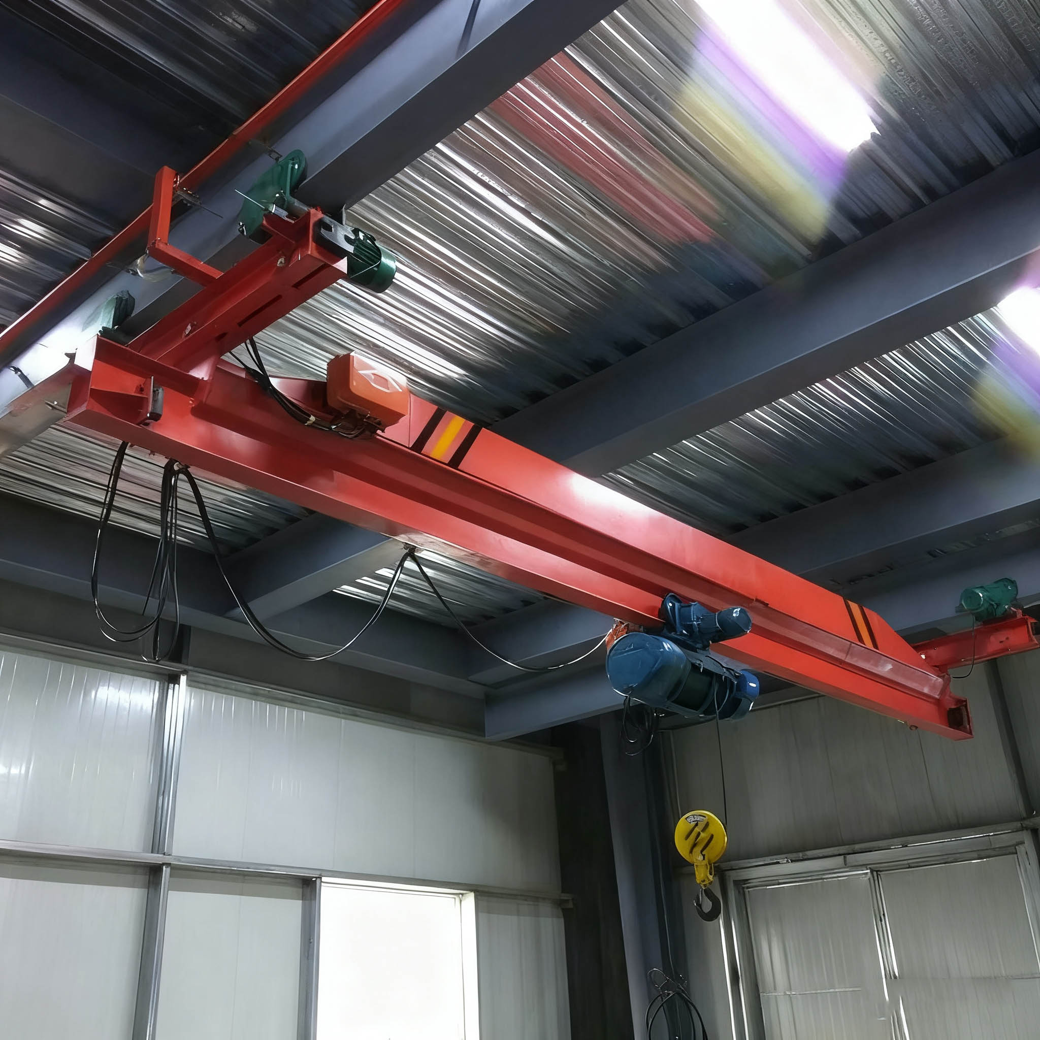 懸掛裝置:通過(guò)車(chē)輪組直接懸掛在廠房頂部的工字鋼軌道上,車(chē)輪與軌道間隙 3-5mm,確保運(yùn)行平穩(wěn)
